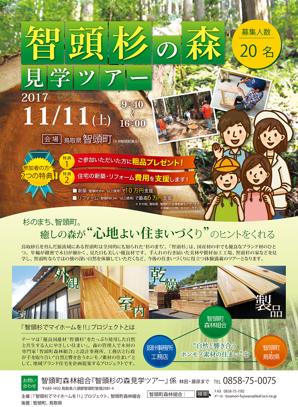 | 主催 | 「智頭杉でマイホームを!!」プロジェクト、智頭町森林組合 |