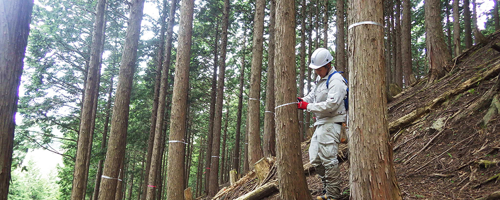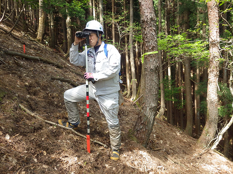 現場作業では、間伐をするための事前調査で作業区域の測量や、所有者の境界の確認、所有者との作業箇所の確認をしています。